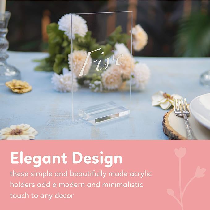 A TOUCH OF ELEGANCE: These 3" clear acrylic sign holders are perfect for displaying table numbers, photos, menus, or cards, adding a clean, sophisticated look to your event.